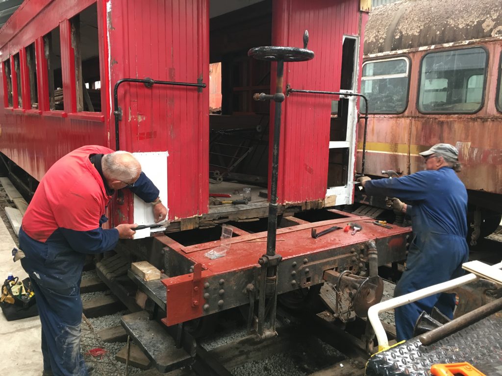 Verandah flooring at the north end of the carriage is being replaced and and ironwork refurbished. Next steps include making a full set of windows, upgrading the floor, repairing carriage internal walls and installing a set of seats.