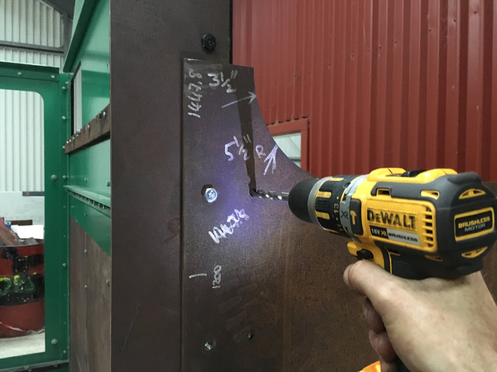 Hugh McCracken driling bolt holes to attach bunker front to cab, 26 October 2019