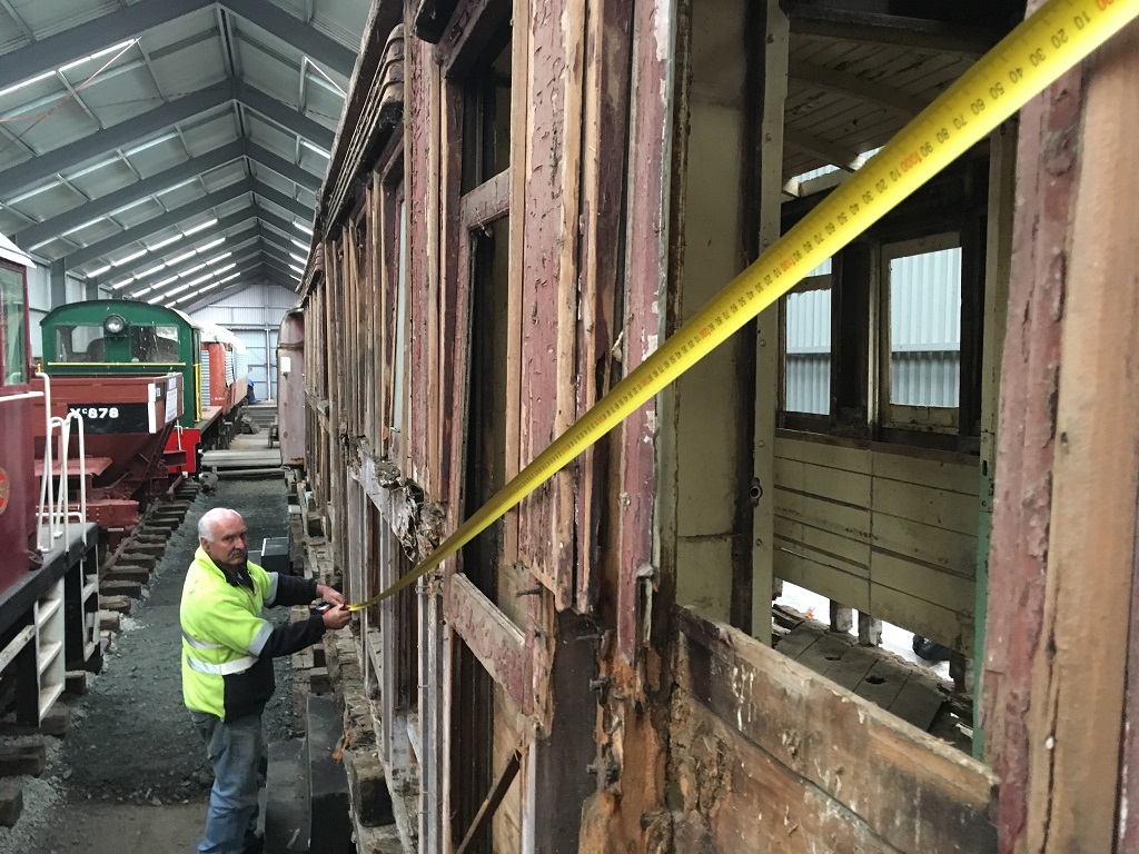 Detailed measurements are being taken of each carriage body half. Next steps involve presenting new top and bottom plates to the carriage sides, marking out the positions of studs and checking against the drawings.