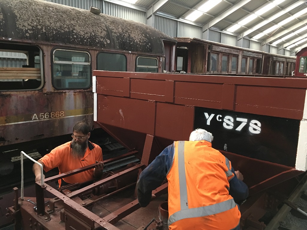 Ray and Ron working on ballast guards of ballast wagon Yc878 on 22 June 2019. The wagon has since been out-shopped.